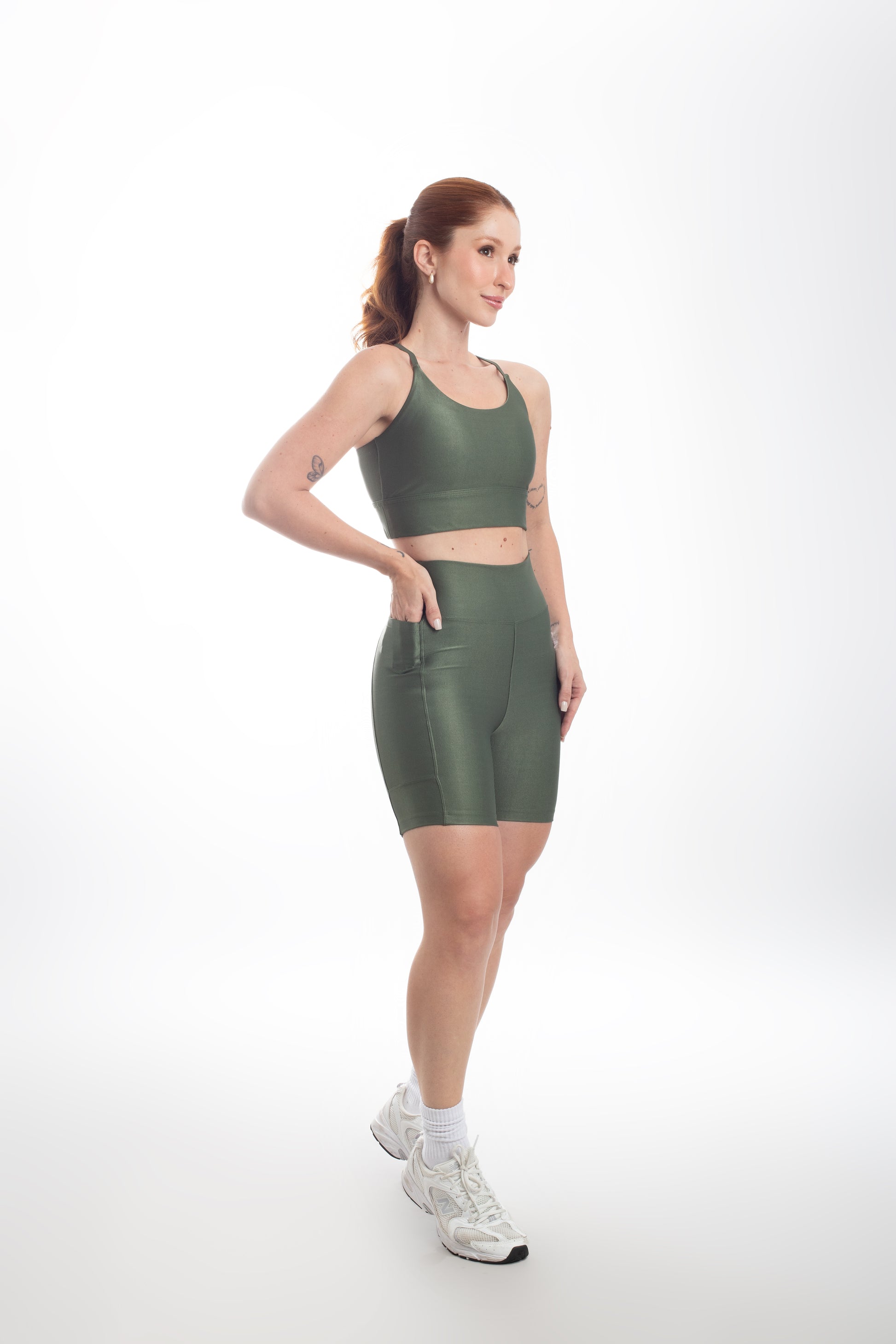 Com bolsos nas laterais que proporciona funcionalidade e praticidade durante as práticas esportivas. Em tecido de média compressão com fio LYCRA com superfície canelada e com leve brilho que adapta ao corpo.